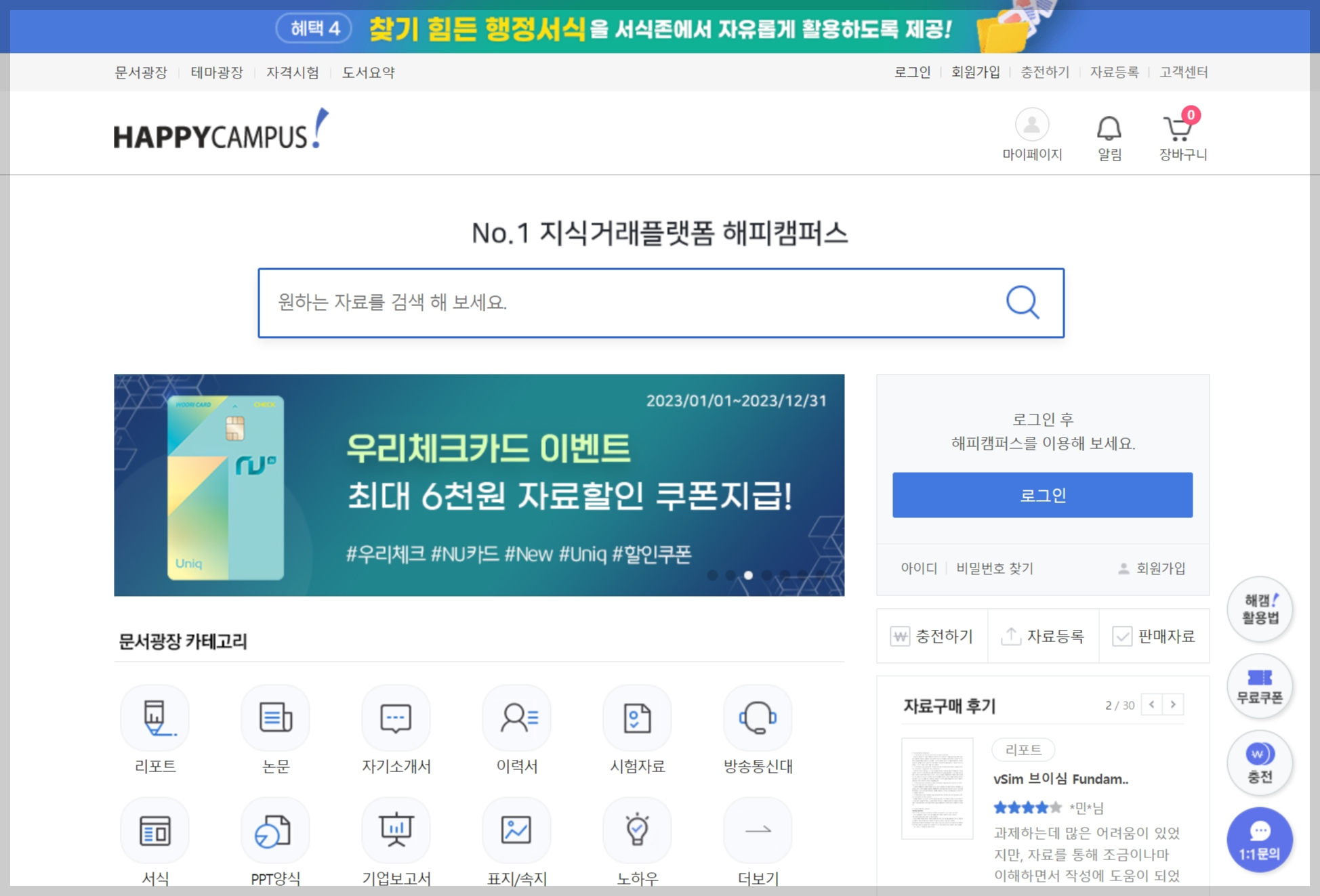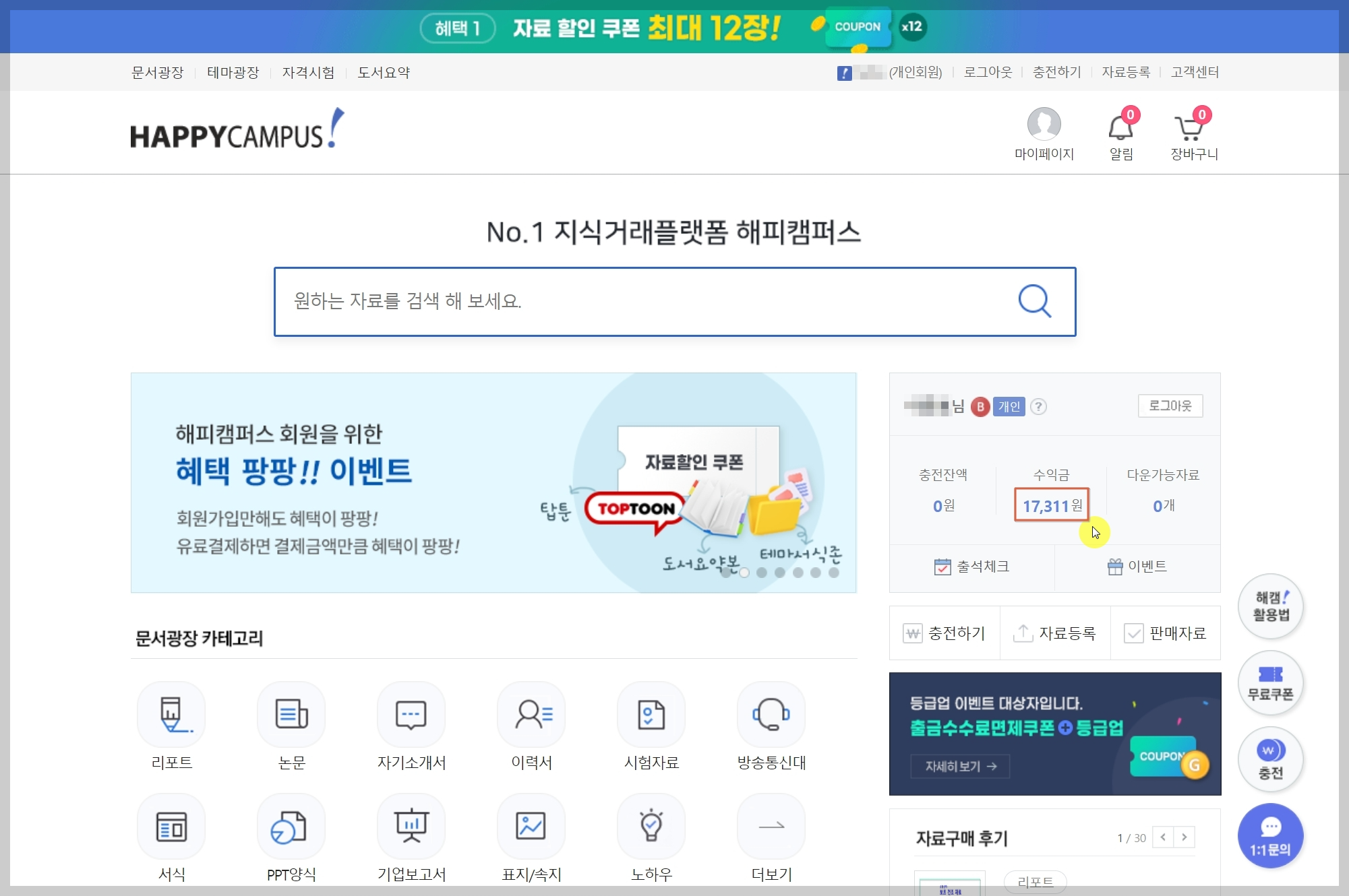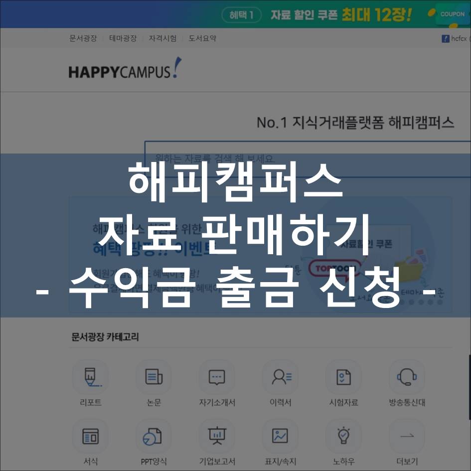 대학교 때 모두 조별과제 하나씩은 해보셨을 겁니다. 그리고 각종 과제로 만든 PPT 파일도 내 컴퓨터의 어딘가 한 구석에 모여 있을 것입니다. 이런 자료들을 그냥 내버려두면 하드디스크에 자리만 차지하는 파일이 되지만, 해피캠퍼스에 자료로 등록하면 내가 아무 일도 하지 않아도 나에게 수익을 가져다주는 복덩이로 변신합니다. 오늘 포스팅에서는 해피캠퍼스에 올려놓은 자료들이 알음알음 판매되어 거둔 소중한 수익금을 출금하는 방법에 대하여 알려드리도록 하겠습니다.