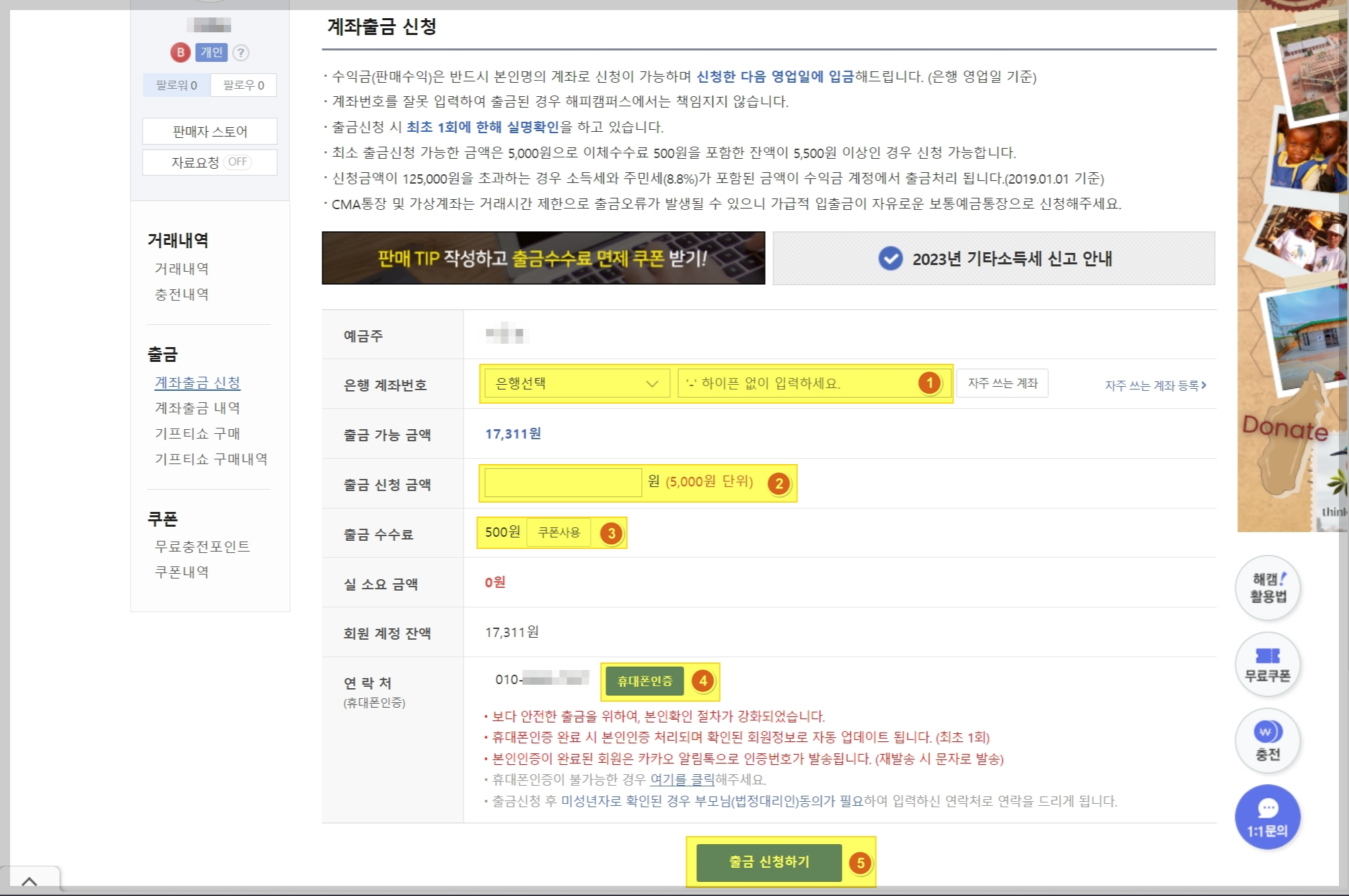 계좌출금 신청 화면입니다. 우선 입금받을 은행을 선택하고 계좌번호를 입력합니다. 그 다음 출금 신청금액을 입력합니다. 출금 신청 금액은 5,000원 단위로 입력 가능합니다. 다음은 출금 수수료 확인입니다. 기본 500원이며 쿠폰이 있을 경우 면제받을 수 있습니다. 여기까지 선택하면 하단 실 소요 금액에 출금 금액 + 수수료 금액이 표시됩니다. 다음 단계는 휴대폰인증입니다. 출금신청 시 최초 1회에 한해 실명확인을 한다고 합니다. 여기까지 완료되었으면 가장 하단에 출금 신청하기 버튼을 눌러 신청을 완료합니다.