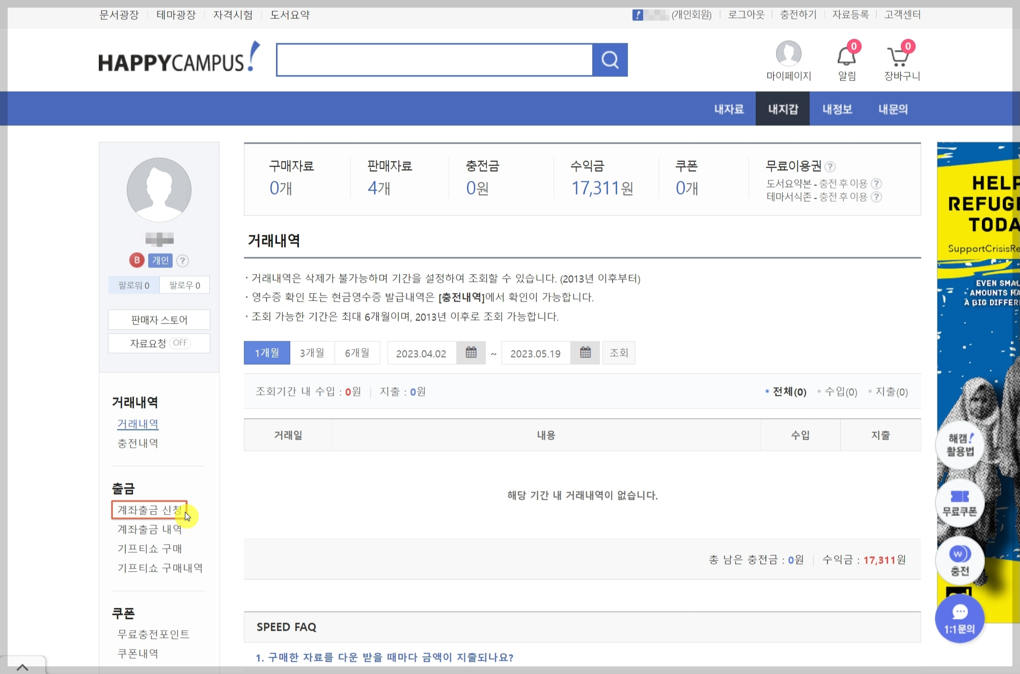 [해피캠퍼스] 자료 판매하기 수익금 출금 신청 방법