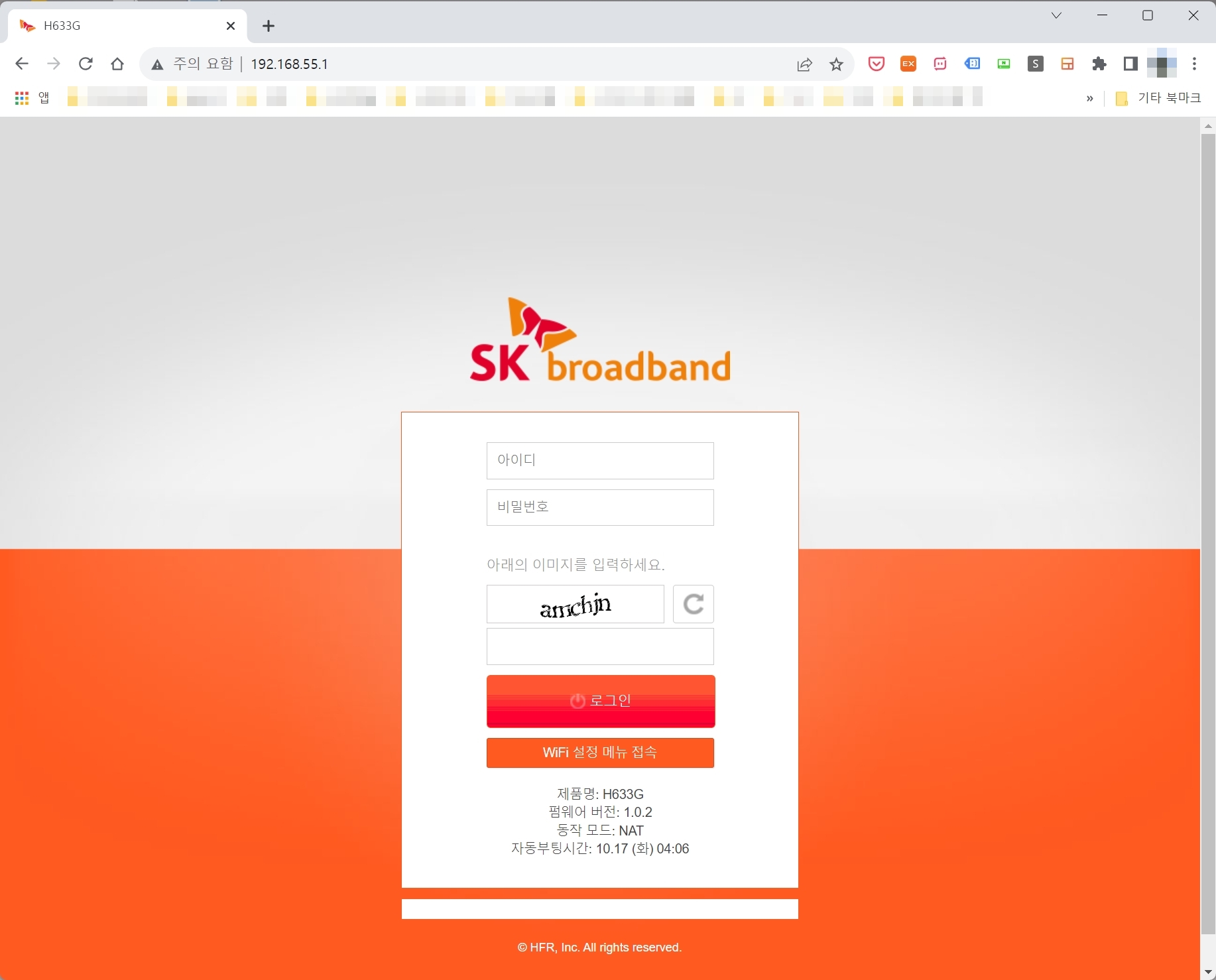 공유기 기본 비밀번호를 알아내는데 성공하셨다면 다음 단계는 공유기 설정창에 접속하는 것입니다. 우선 공유기에 연결된 PC에서 인터넷 창을 켭니다. 그 다음 192.168.55.1 을 입력 후 접속하면 아래와 같은 화면이 나타나게 됩니다.
