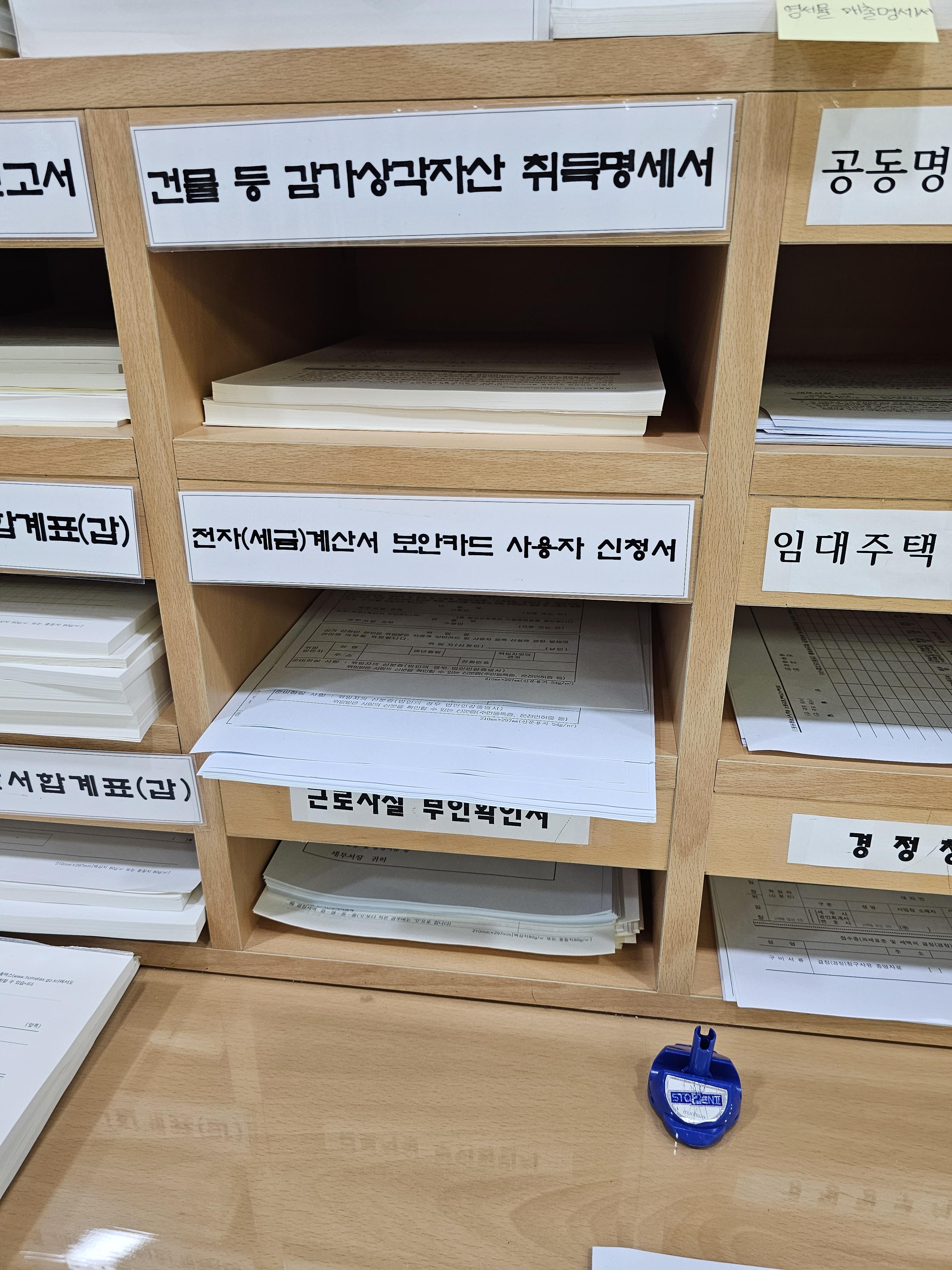 안에 계신 직원 분께 전자(세금)계산서 보안카드 발급을 위해 방문했다고 말씀드리니 해당하는 양식을 작성 후 접수하라고 알려주셨습니다.
