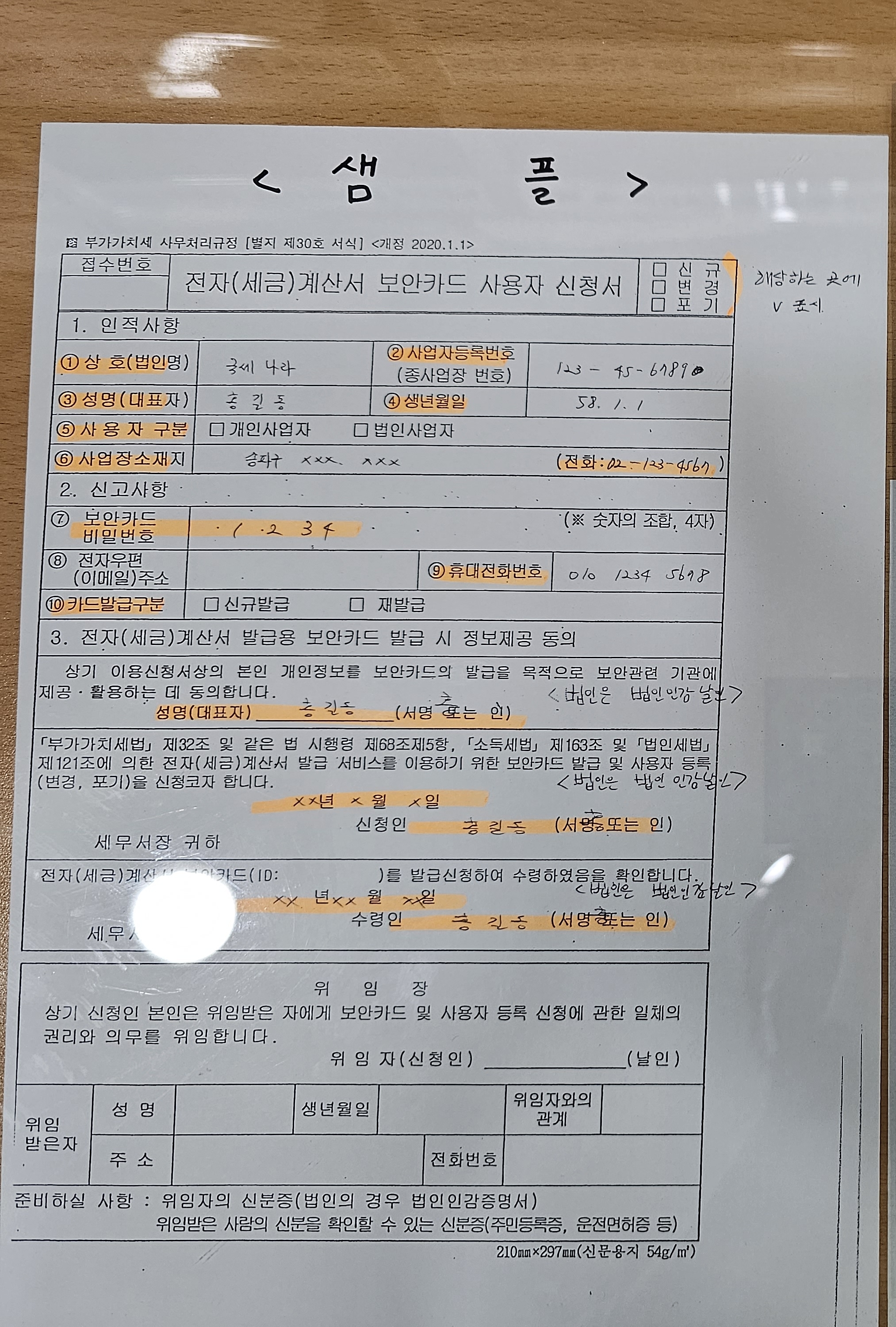 [전자(세금)계산서 보안카드 사용자 신청서] 양식 샘플입니다. 위와 같이 작성하시면 됩니다. 만약 모르는 부분이 있다면 직원 분께 여쭤보면 친절하게 답변해주십니다. 모든 작성이 끝나면 자신의 신분증과 위 신청서를 함께 제출하면 됩니다.