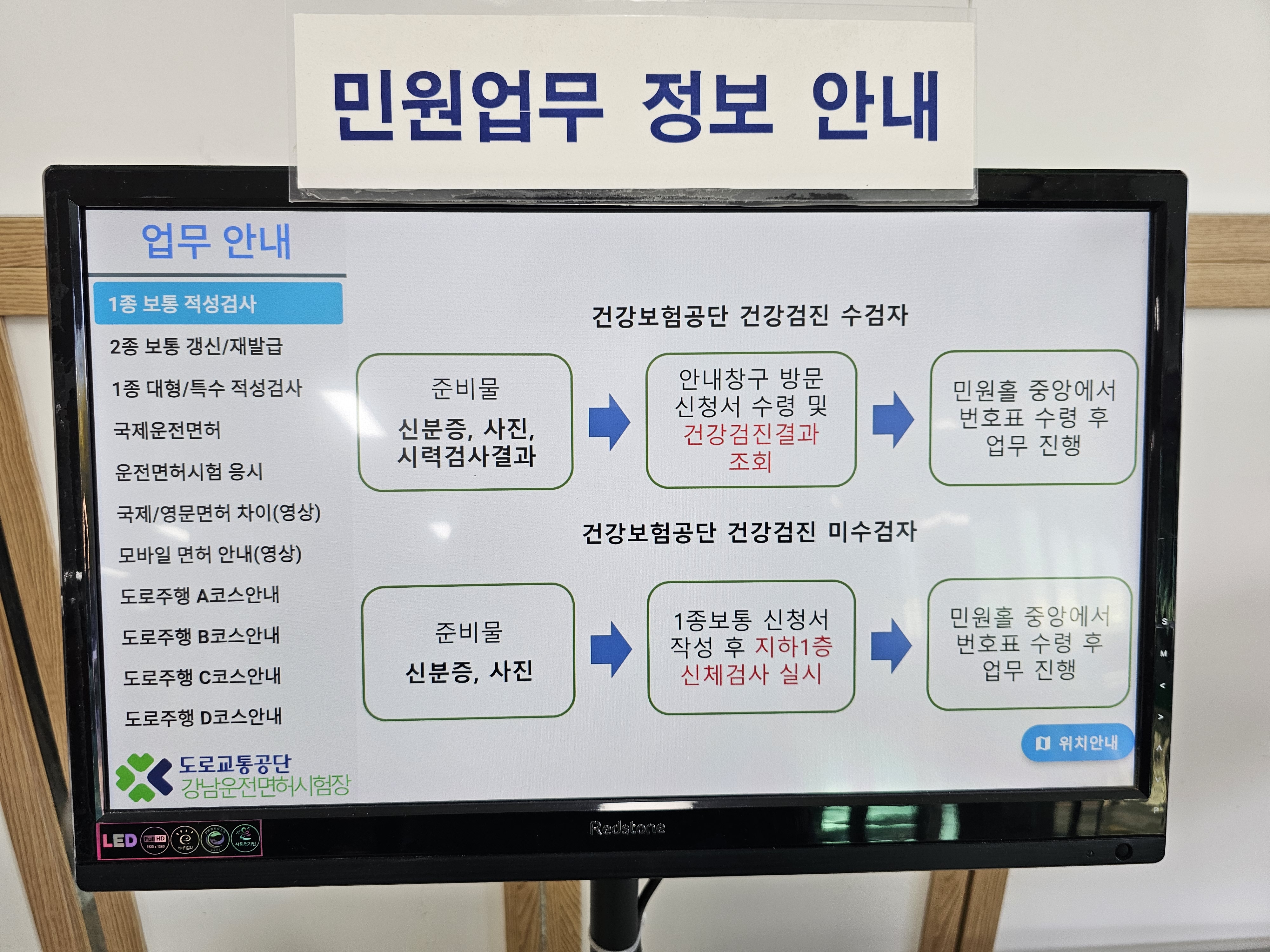 민원업무 정보 안내 키오스크도 마련되어 있어서 각종 업무의 진행 과정을 한눈에 살펴볼 수 있었습니다. 운전면허증 갱신은 면허의 종류에 따라 1종 보통 - 적성검사, 2종 보통 - 갱신으로 지칭합니다. 1종 보통 적성검사 진행 절차는 건강보험공단 건강검진 수검 여부에 따라 다른데 그 순서는 다음과 같습니다.