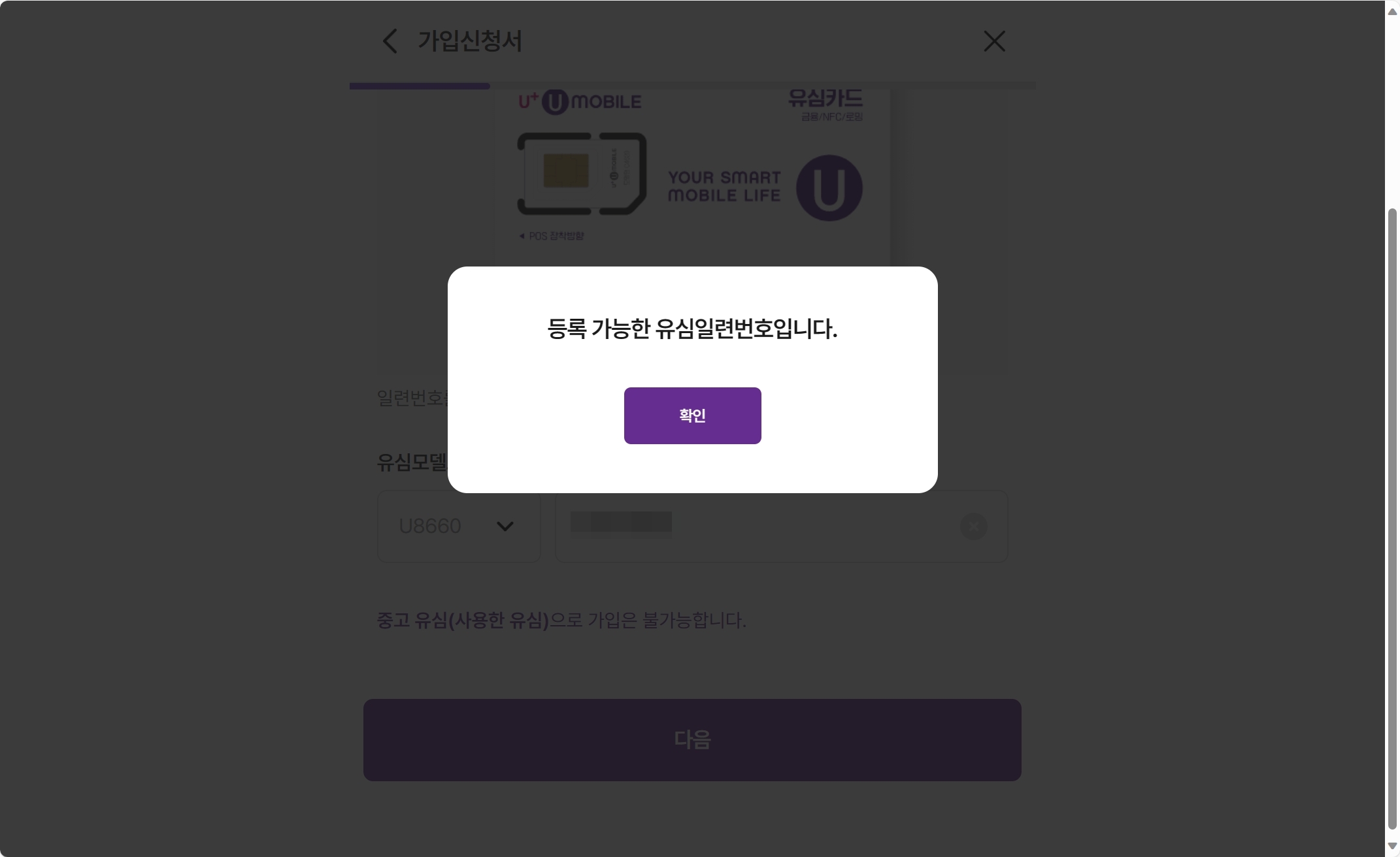 유심모델 코드, 일련번호를 입력 후 다음 버튼을 클릭했을 때 위와 같이 [등록 가능한 유심일련번호입니다.]라는 문구가 나오면 정상적으로 처리된 것입니다.