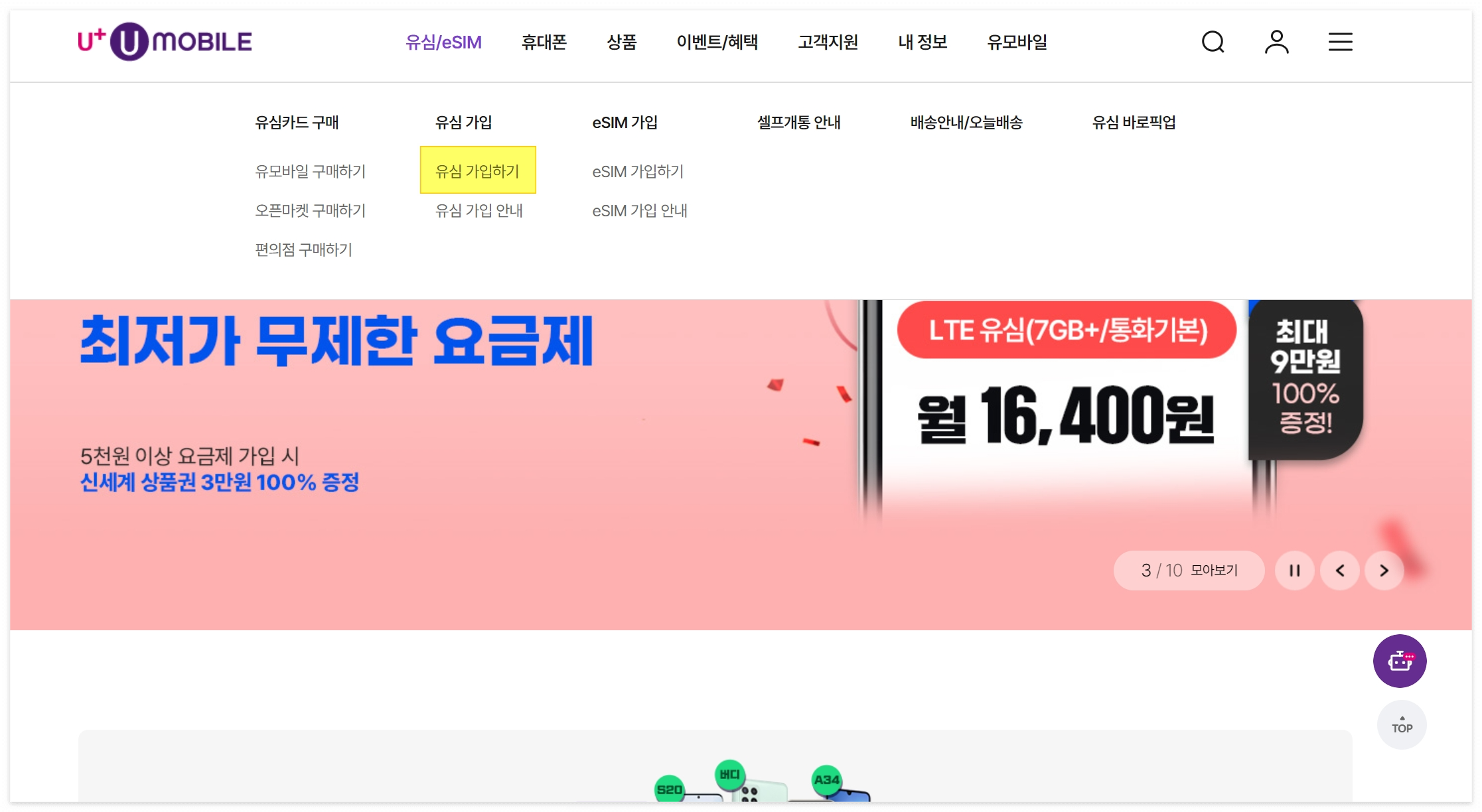 홈페이지에 접속하셨다면 상단에 있는 유심/eSIM > 유심 가입 > 유심 가입하기를 클릭합니다.