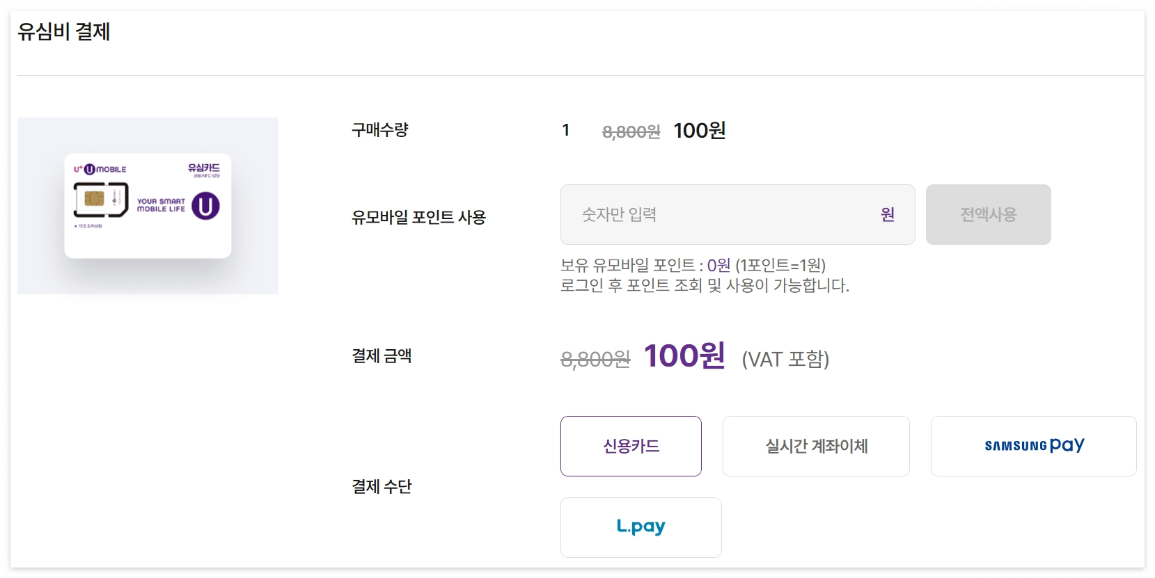 본래 1개당 8,800원(부가세 포함)인데 홈페이지를 통해 구매하면 단돈 100원에 구매가 가능합니다. 알뜰폰도 경쟁이 치열하다보니 유심은 형식상 최소한의 비용만 받고 가입자 유치에 나서는 것 같습니다.