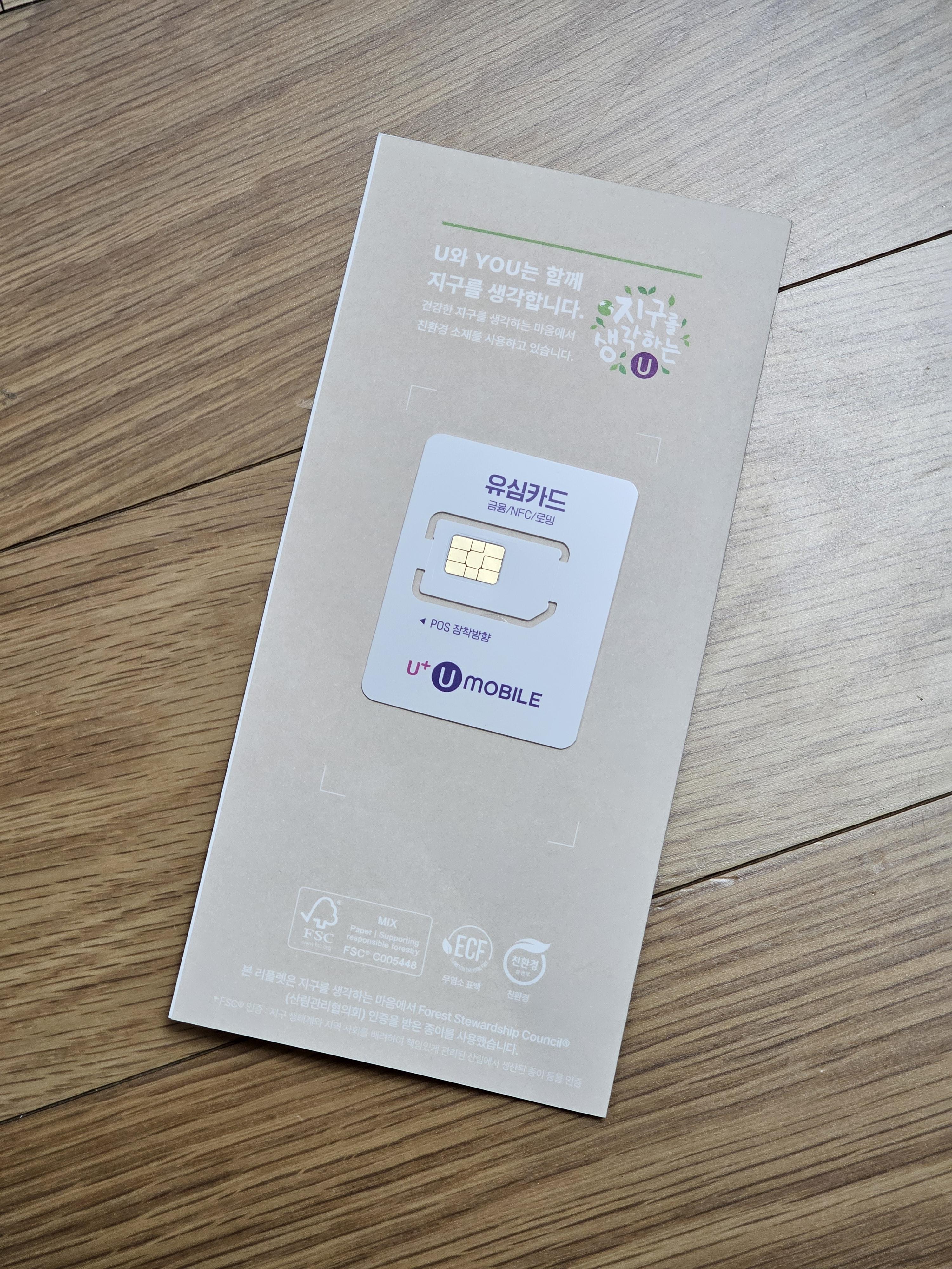 유심은 생각보다 빠르게 도착했습니다. 유모바일 유심은 친환경 느낌이 강한 종이 패키지에 붙어져 배송됩니다. 유심카드 자체도 예전에 신용카드 크기의 유심카드와 비교하면 불필요한 부분을 많이 덜어낸 형태입니다. 아무래도 실제 사용되는 스마트폰 유심의 대부분이 나노심을 채택하고 있고 그외의 부분은 버려지는 플라스틱이라는 점을 생각하면 이런 변화는 환경을 위한 바람직한 변화라고 할 수 있습니다.