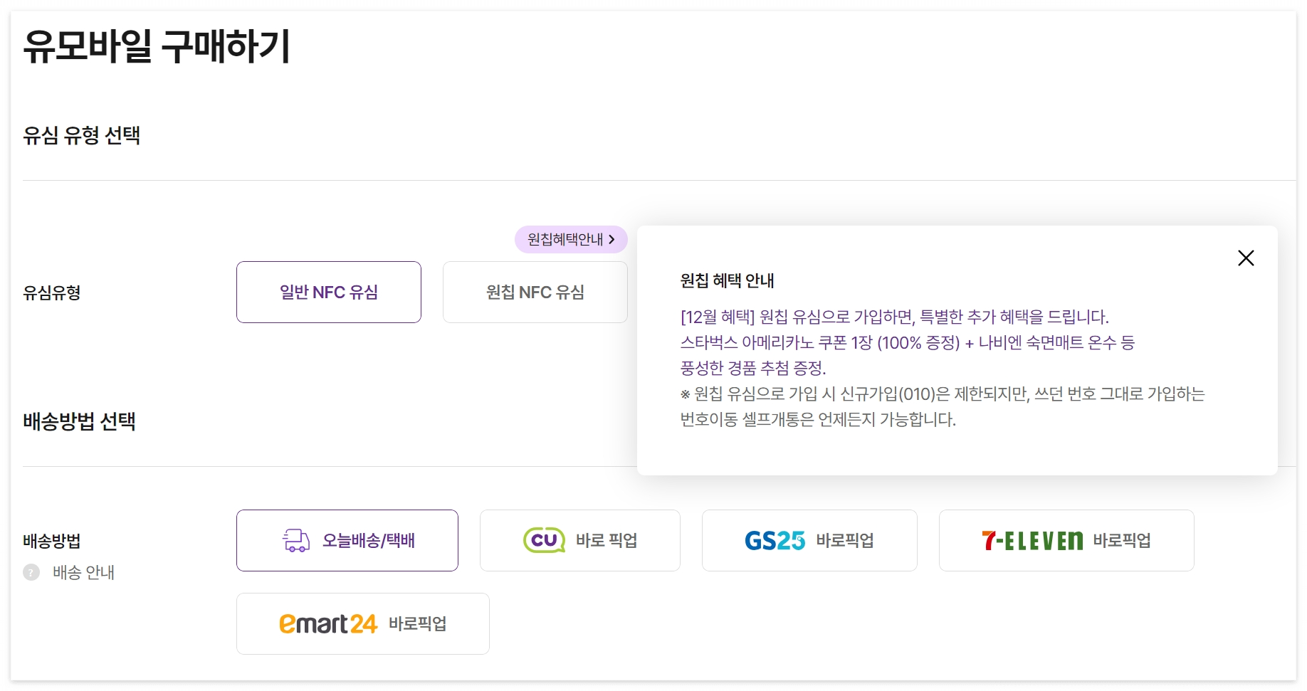 가장 먼저 유심 유형을 선택합니다. 일반 NFC 유심은 오늘배송/택배 외에 편의점 바로픽업도 가능하므로 원칩 NFC 유심보다는 일반 유심으로 구매하는 것을 추천합니다.