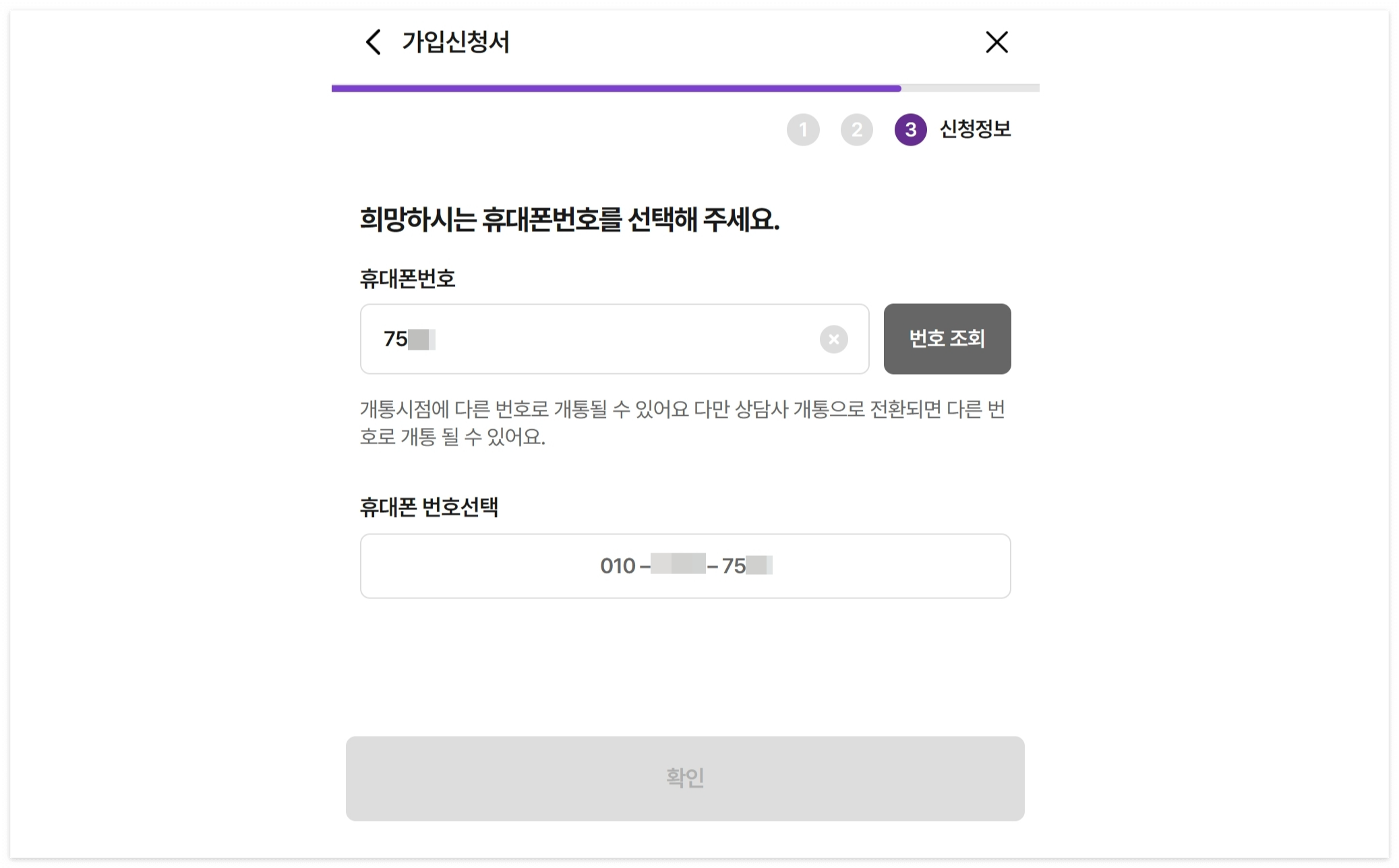 위와 같이 원하는 4자리 숫자를 입력한 후 번호 조회를 클릭하면 휴대폰 번호 선택란에 선택 가능한 번호가 나오게 됩니다. 저 같은 경우에는 단 하나의 번호만 나왔는데 다행히 원하는 조합의 번호가 나와서 바로 선택하였습니다.