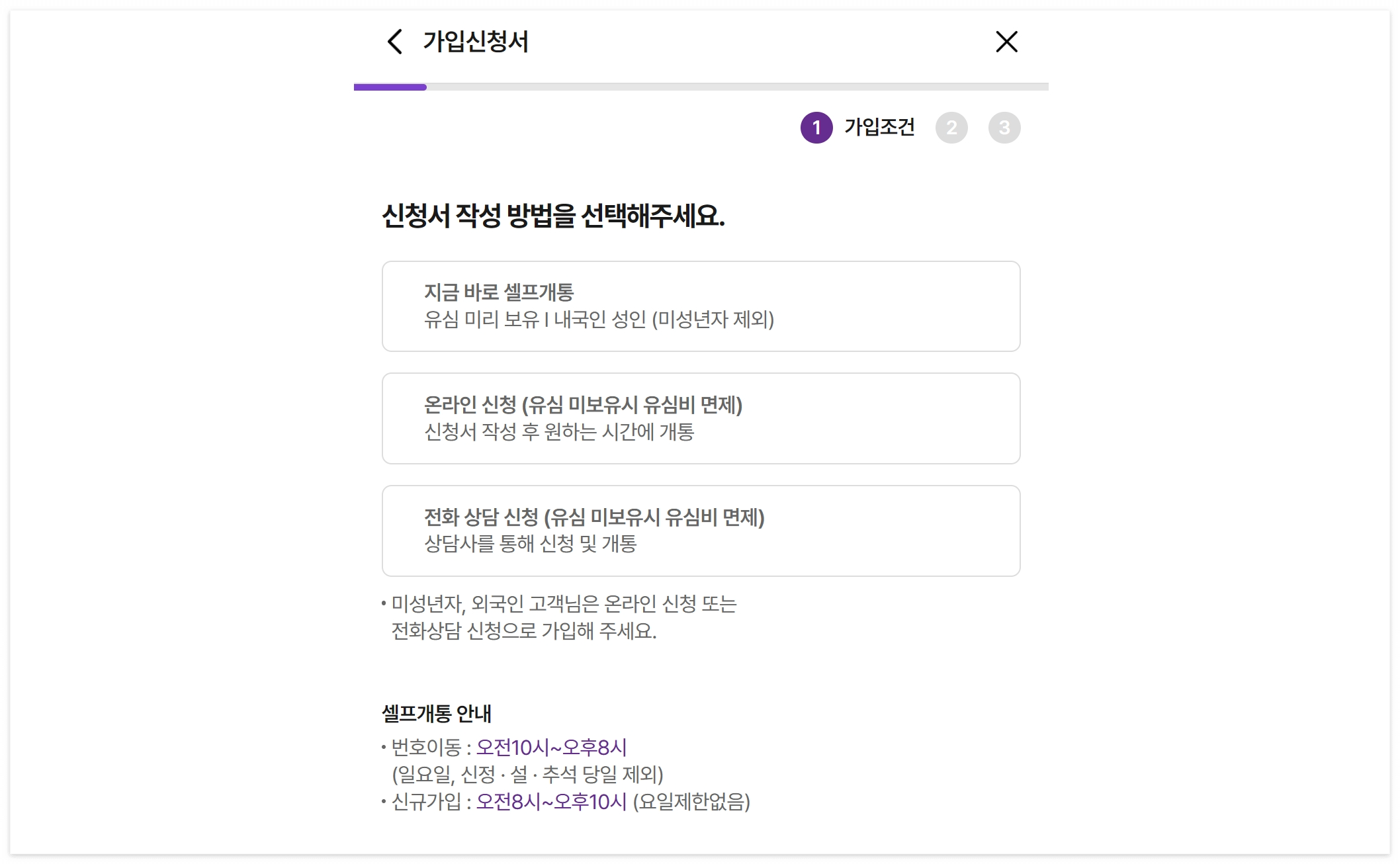 신청서 작성 방법 중에서 지금 바로 셀프개통을 선택하면 됩니다. 온라인 신청, 전화 신청 방법도 있지만 셀프개통이 가장 빠르게 개통할 수 있는 방법입니다.