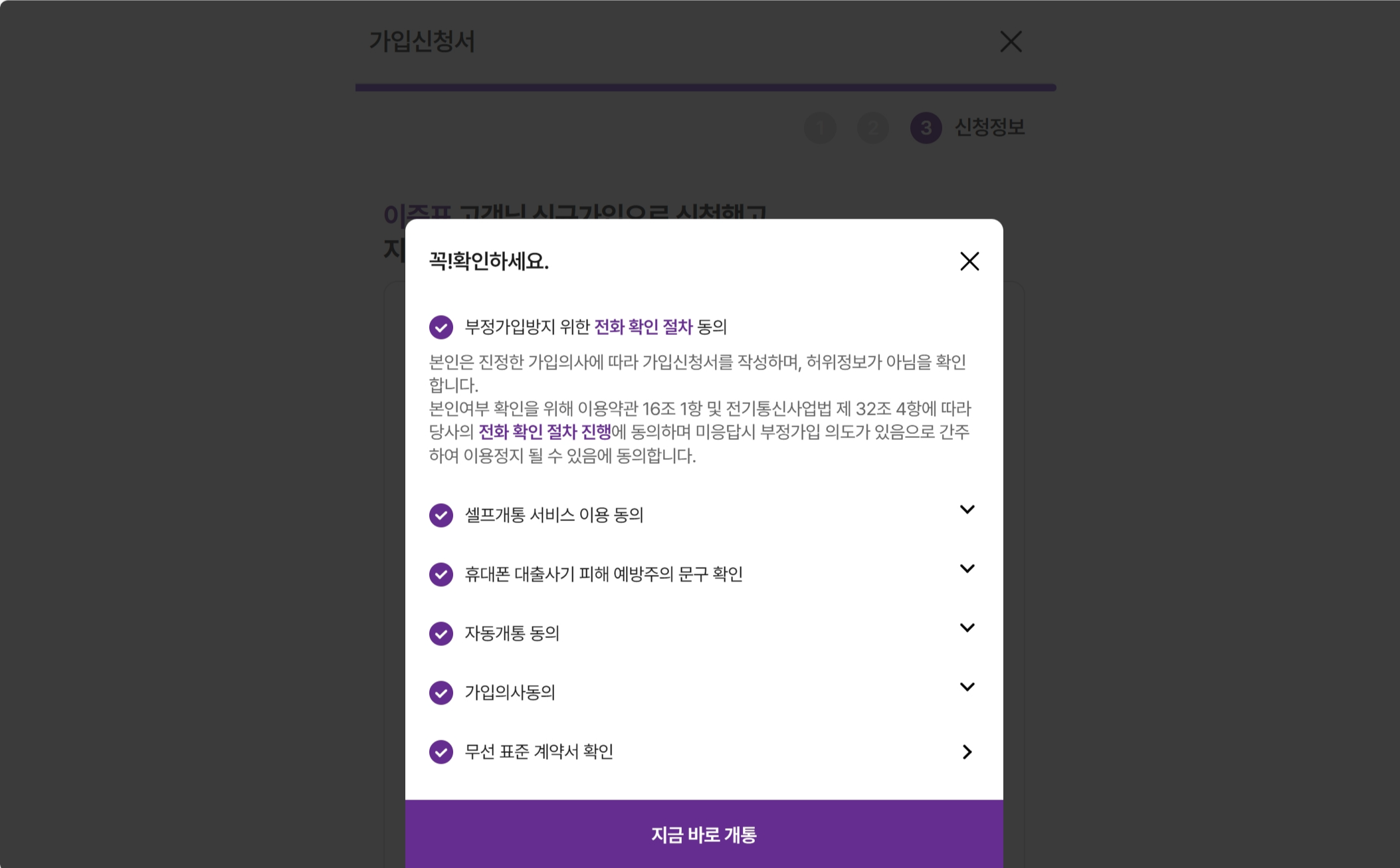 다음은 계약 내역 확인입니다. 부정가입방지 위한 전화 확인 절차는 가입자 본인의 의사로 가입하는 것이 맞는지 확인하는 필수적인 절차이므로 동의하지 않으면 이용정지 될 수 있다고 합니다. 그 외에 사항도 가입시 확인할 것들이므로 전부 확인하시고 지금 바로 개통 버튼을 클릭합니다.
