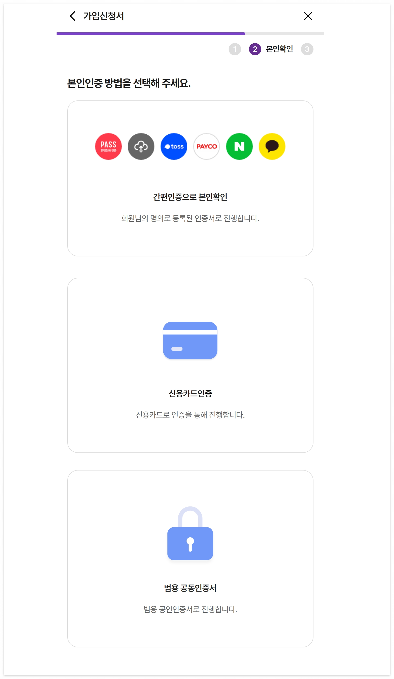 다음은 본인인증 단계입니다. 인증 방법은 간편인증, 신용카드인증, 범용 공동인증서 세 가지 중 하나를 선택하시면 됩니다. 요즘에는 토스, 카카오톡 등을 이용한 간편인증이 있어 본인인증시 매우 편리해졌습니다.