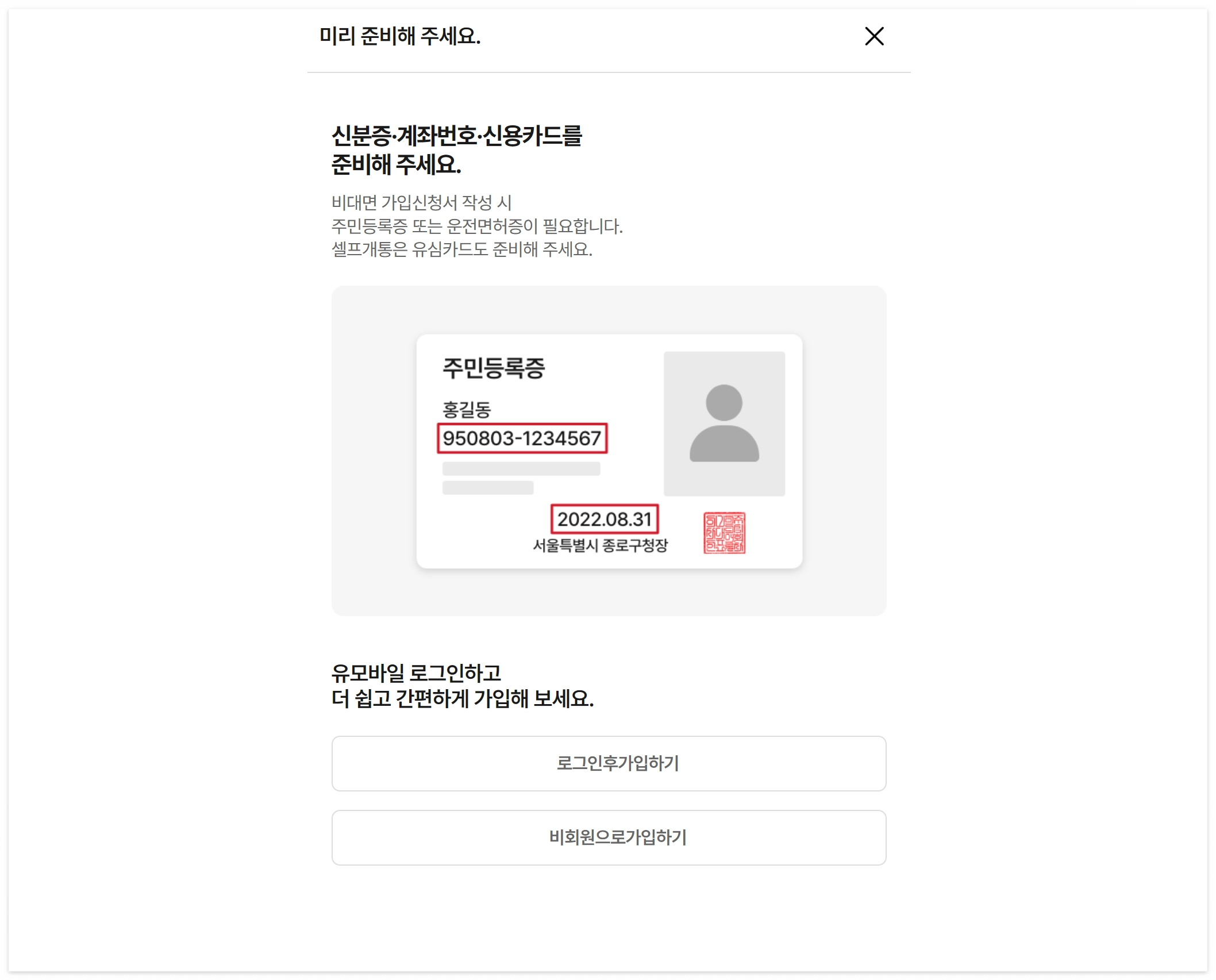 유모바일 셀프개통은 회원, 비회원 상관없이 진행 가능합니다. 개통 전 미리 준비해야 하는 것들은 신분증, 계좌번호, 신용카드 정도입니다. 매우 간단하므로 진행 중에 챙기셔도 늦지 않습니다.
